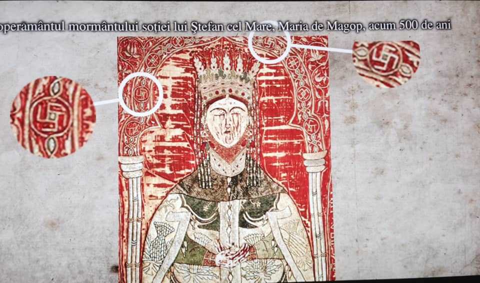 În mormântul soției lui Ștefan cel Mare, al Mariei de Mangop s-au găsit pe mantia ei aceleași svastici.